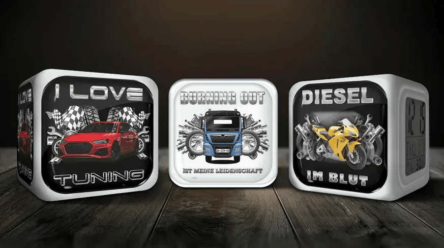 You can create your own personalized cube alarm clock in just one minute! ... Refresh preview ... Alarm Clock Cube Vehicle Tuning Your personalized LED cube alarm clock You can get your LED cube alarm clock with your desired motif (car or photo) in a cool design. Many design variants in the range. Choose according to your preferences. Manufactured in an estimated 3 days Your cube alarm clock will be ready for dispatch within 3 working days of receipt of your order. A personal and unique gift Our personalized products are among the unusual gifts that every car driver and car fan will be delighted to receive. CREATE ALARM CLOCK HERE Personalized digital cube alarm clock made for you! Customized production Perfect as a gift Practical benefits Fast delivery Made in Germany falsefalse More products from Auto4Style Feedback from our customers 4.9 4.9 out of 5 stars (based on 270 reviews) Excellent92%Very good6%Average2%Poor0%Terrible0% Tableau des clés 20.02.2026 Ravie de cette achat, qui a fait plaisir à une collègue qui était très satisfait de ce cadeau, la livraison est respectée, encore un grand merci a toutes l’équipe continuez à faire ce que vous faites c’est originale et sympa bonne continuation à tous merci Mickaël Articoli 🔝 10.02.2026 Ho acquistato il portachiavi personalizzato con la profumazione alla vaniglia. Molto bello ed elegante, come mi aspettavo. Sono stata veramente contenta, la spedizione ci ha messo un po’ ma è arrivato perfetto. Rebecca Autositz- Organizer 09.01.2026 Absolut tolles Produkt, super Qualität und Verarbeitung, so schön hatte ich es mir garnicht vorgestellt!!! Vielen Dank dafür. Annett Lange Warten 08.01.2026 Ich bin mit dem Produkt sehr zufrieden aber das man so lange warten muss finde ich ein bisschen schade. Leonie Schlüsselanhänger 07.01.2026 Der Schlüsselanhänger sieht mega aus, auch die Farbe ist perfekt, wie die orginal Autofarbe. Ich bin total glücklich mit dem Artikel, auch die Lieferzeit ist für einen personalisierten Artikel vollkommen ok., vielen Dank an das Team!!! Annett Schlüsselanhänger 29.12.2025 Vielen Dank an das ganze Team, kam heute noch am 24.12 an obwohl wir spät bestellt hatten. Die Freude war riesig und der Schlüsselanhänger sieht mega aus. Gibt von uns volle Sterne Vielen Dank an alle Claudia Autoschlüsselbrett 16.12.2025 Sehr lange Wartezeit aber es hat sich gelohnt zu warten, mega cool. Ortis T-Shirt 25.11.2025 Bissl Wartezeit aber ich bin zu frieden, hatte erst Zweifel, da einige Bewertungen nicht so toll waren. Aber nein ich bin zu frieden Mandy Très bien 01.08.2025 Très contente de mon achat ! Un cadeau qui fera très plaisir. Commander le 18/07/2025 et recu le 31/07/2025, je m attendais même a un délai de livraison plus long au vu des commentaires. Etuit de très bonne qualité ! Laura Hundeanhänger 07.06.2025 Sehr schöner Hundeanhänger bin begeistert das entschädigt die längere Wartezeit. Kann ich nur weiter empfehlen. Gina Alles bestens schönes Design und gute Qualität 07.06.2025 Habe den Schlüsselanhänger am 19.05.25 bestellt am 04.06. Nachricht, Ware ist auf dem Weg. Am 06.06 Ware erhalten. Bin sehr zufrieden mit dem Design, ist ein Geschenk für meine Tochter. Hat zwar etwas länger gedauert, habe rechtzeitig bestellt und die Freude war umso größer. Gerne wieder. Sabine Strauch Hundeanhänger kette 15.05.2025 Es hat zwar sehr lange gedauert bis mein anhänger da war,es war die schuld von DHL,aber ich bin total begeister von dem ergebniss. Ein sehr schöner anhänger. Beate Hiller Alles super gewesen und echt coole Anhänger 04.02.2025 Also die negativ Bewertungen kann ich leider nicht nachvollziehen. Habe trotzdem bestellt und alles super gewesen sehr schöne Anhänger. Der etwas längere Versand ist je nach Auftragslage und auch mit dem Versanddienstleister zu Folge zuführen. Erfahrungsgemäß mit der Pin AG ist eine etwas längere Versandzeit wie mit anderen. Aber man sollte einfach etwas Geduld haben. Kann es nur weiter empfehlen und war auch nicht die letzte Bestellung. Matthias Sehr schönes Design und hohe Qualität 13.01.2025 Hat zwar etwas länger gedauert, aber dafür war die Freude um so größer. Gerne wieder. Wimmer Johann Kfz Sticker 06.01.2025 Echt toller Kfz sticker Habt ihr fein hinbekommen. Werde in nächster Zeit noch einiges bestellen. Vielen Dank Friedrich Lebenbauer Show more ratings Write a new Review